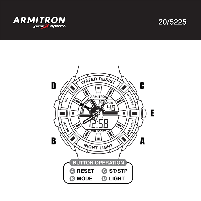 Download PDF user manual for E. Gluck Corp – Armitron Pro Sport 55.5mm WR330FT (WR100M) Analog-Digital Chronograph Watch Model: 20-5225 (EN) 2 pages 2017 zip
