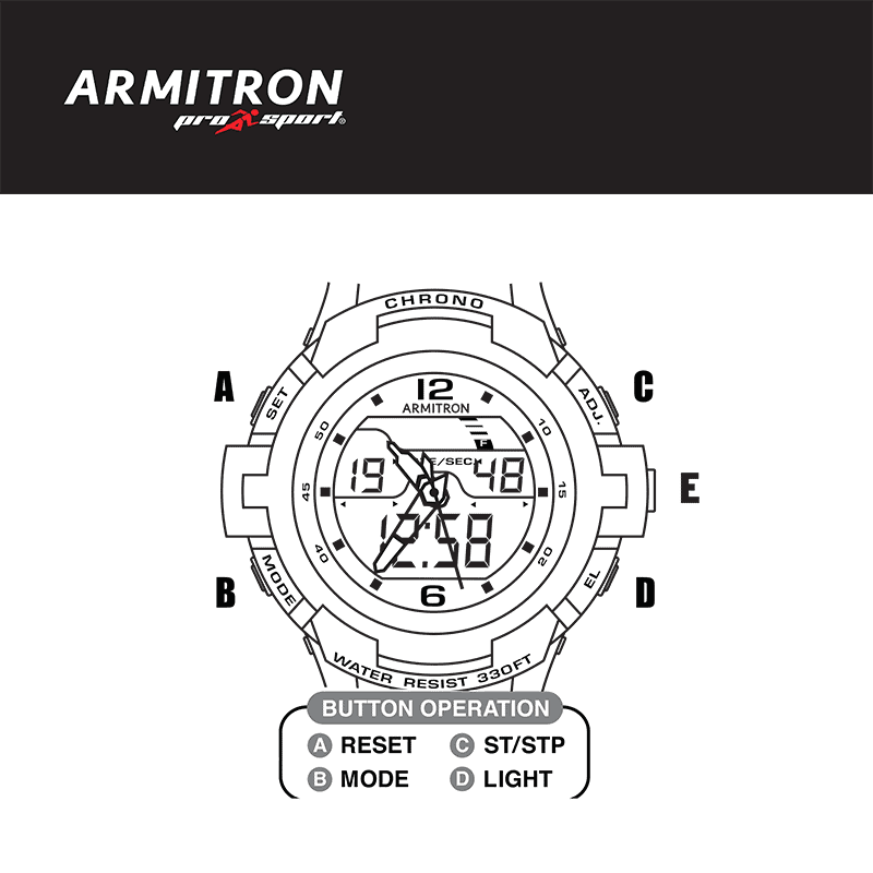 Download PDF user manual for E. Gluck Corp – Armitron Pro Sport 48mm WR330FT (WR100M) Analog-Digital Chronograph Watch Model: 20-5228 Module: (AD1159) (EN) 2 pages 2017 zip