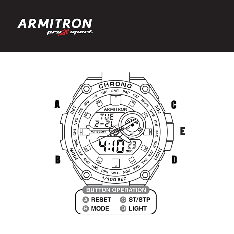 Download PDF user manual for E. Gluck Corp – Armitron Pro Sport 54mm WR330FT (WR100M) Analog-Digital Chronograph Watch Model: 20-5242 Module: (AD1161) (EN) 2 pages 2017 zip