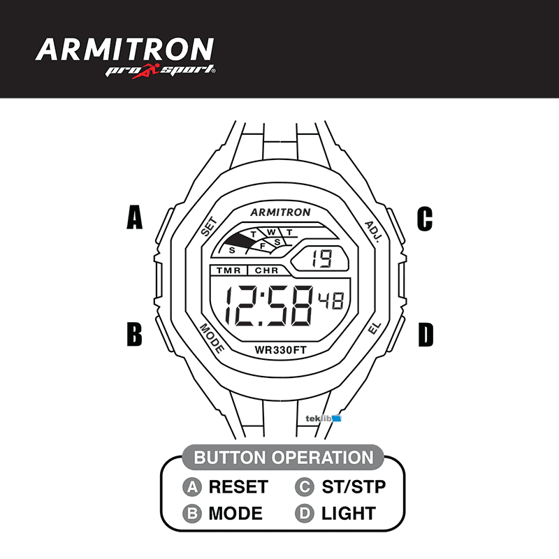 Download PDF user manual for E. Gluck Corp – Armitron WR330FT (WR100M) Digital Chronograph Watch Model: 40/8412 (EN) 2 pages 2017 zip