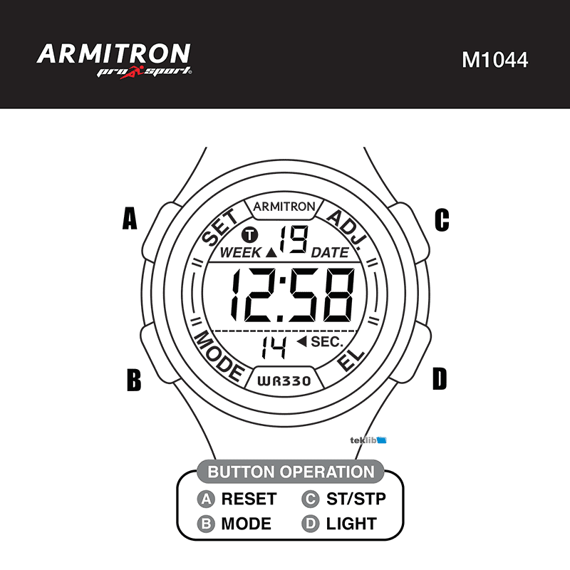 Download PDF user manual for E. Gluck Corp – Armitron PLUMS 37mm WR330FT (WR100M) Digital Chronograph Watch Model: 45-7113 Module: M1044 (EN) 2 pages 2017 zip