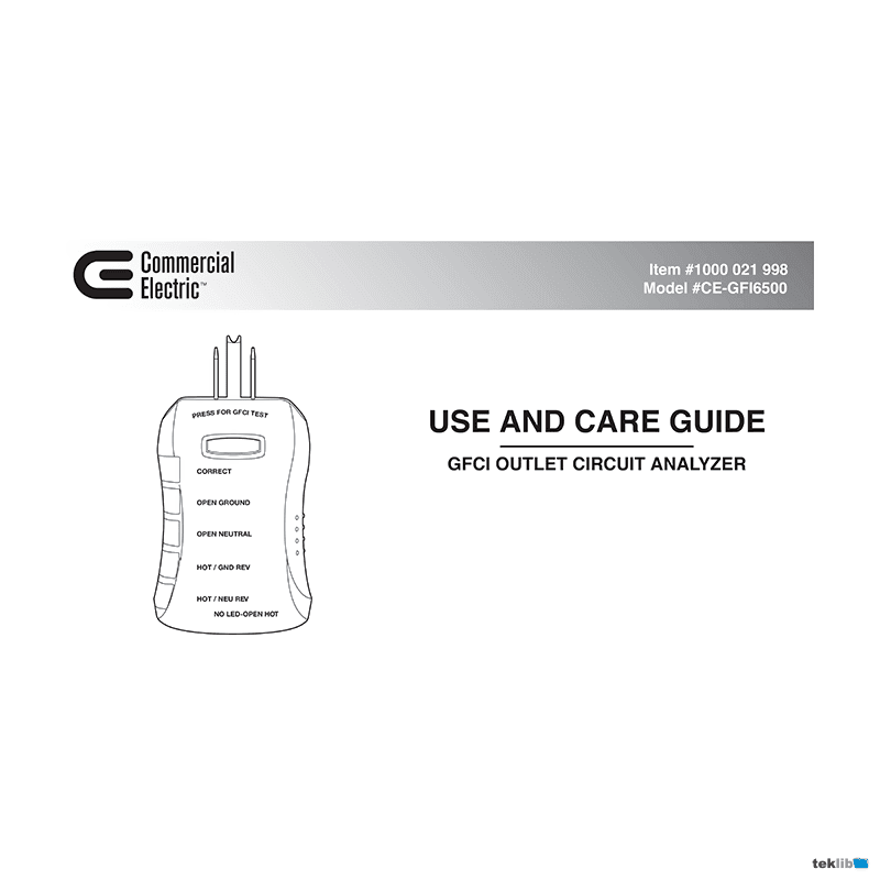 This PDF user manual is for the Commercial Electric GFCI Outlet Circuit Analyzer model # CE-GFI6500 item # 1000 021 998.