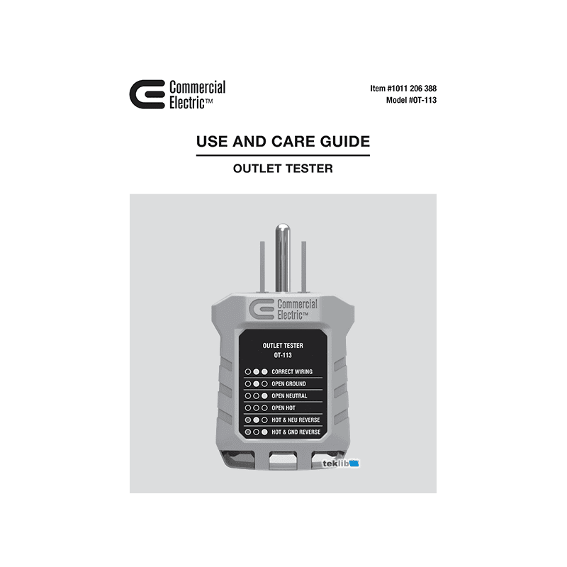 This user guide provides all the information from COMMERCIAL ELECTRIC about the model OT-113 / item 1011206388 outlet tester, as detailed in the table of contents. Reading it completely will address most questions you might have. You can download and save it for offline use, including viewing it on your device or printing it for your convenience if you prefer a paper version.