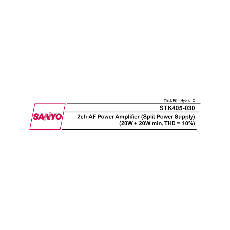The STK405-030, a member of the STK405-000 series, is a low-cost, 2-channel audio power amplifier hybrid IC that is ideal for a wide range of stereo sets. It has dedicated 6 Ohm output drive, in contrast with the STK401-000 series which supports 6 Ohm / 3 Ohm output drive.